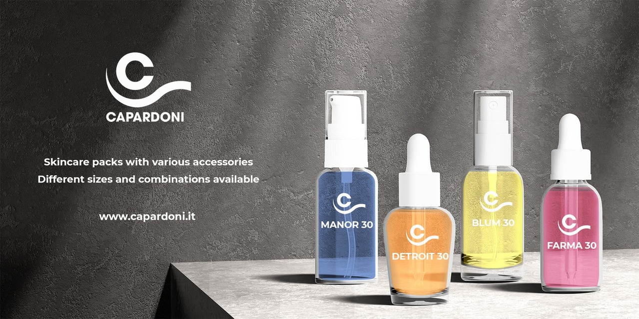 Capardoni è lieta di presentare la nuova linea di flaconi skincare in vetro “Pharma look” completa con differenti accessori: contagocce, lozioni o pompe spray.