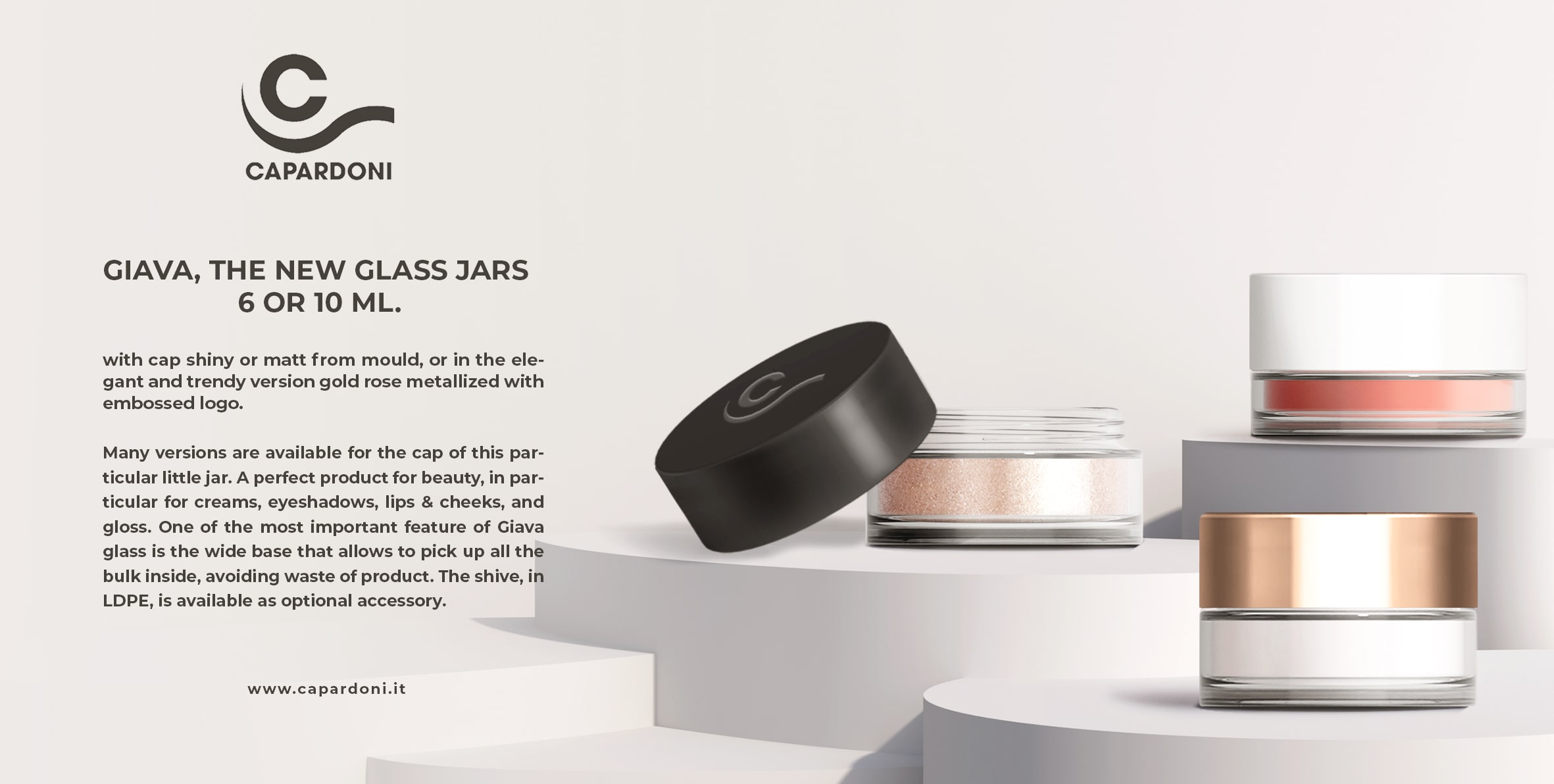 Capardoni presenta Giava, il nuovo vaso in vetro da 6 o 10 ml con coperchio lucido o opaco da stampo, oppure nell’elegante versione metallizzata in oro rosa con logo inciso.